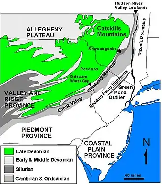 Map of the "Sedimentary Appalachians" Province in the New York Bight region including the Valley and Ridge Province and the Allegheny Plateau and the Catskill Mountains