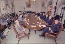 A number of Kittinger reproductions can still be found in the West Wing office area of the White House in Washington, D.C. Colonial Williamsburg Foundation interior designers were commissioned by President Richard Nixon in 1970 to redo the interior design of the President's offices. Kittinger Company furniture was used extensively in the redesign since this company was the sole licensee of furniture for the Colonial Williamsburg Foundation's famous program to produce exact reproductions of 18th century antiques.[6] Included in the redesign was a new conference table and chairs for the cabinet room. President Nixon wrote a personal check to pay for the new cabinet room table custom made by The Kittinger Company and donated it to the White House.