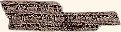Early inscriptions in Tocharian, an Indo-European language using a derivation of the Indian Brahmi script is used in several early paintings on tablets, as found in the Cave above the cave of the coffered ceiling (Cave 171),[56] or the Cave of the Niche (Cave 27).[71]