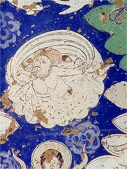 The 1st Style, sometimes called "First Indo-Iranian style" to denote influences from India and Central Asia, covers a period from 300 to 500 CE, and is characterized by Gandharan themes and orange and green hues, having a strong flavour of India: female dancers and musicians are often naked or half-naked with full breasts.[65][66] The art of these paintings is quite refined, and forms the "Classical" period of the art of Kizil: the shades are delicate, the lines are fine and elegant, the colors blend progressively to give a sense of texture and volume.[67] The paintings of Bamiyan in northern Afghanistan are generally considered as the precussors of the art of the Kizil Caves.[68] Towards the end of the period, the influence of the art of Gandhara is considered as a consequence of the political unification of the area between Bactria and Kucha under the Hephthalites, which lasted from 480 to 560 CE, or a few decades later.[69]