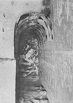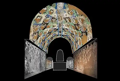 A large vaulted chamber is located in front of the "central pillar" column and a smaller rear chamber behind with two tunnel-like corridors on the sides linking these spaces. In the front chamber, a three-dimensional image of Buddha would have been housed in a large niche serving as the focus of the interior, however, none of these sculptures have survived at Kizil.[18] The rear chamber may feature the parinirvana scene in the form of a mural or large sculpture, and in some cases, a combination of both. The "central pillar" layout is possibly related to the structural design of Kara Tepe in northern Bactria.[19]