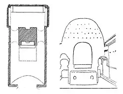 Grünwedel removed a great number of paintings, but was careful to make records before doing so in order to retain their archaeological value, and to photograph or draw them before cutting them out, out of fear that they could be destroyed upon removal or during transport.[30] He used a canvas to take quite precise records of the paintings. For example, Grünwedel recounts how he discovered a very interesting mural with warriors in the Cave of the Painters (207). Intending to remove it, he first made a precise drawing. But once the drawing was made, the mural disintegrated upon removal and was lost, except for a few fragments still in-situ.[31] Altogether, the Third German Expedition still removed many paintings, and shipped almost 120 crates of murals to Berlin.[32] Grünwedel published the result of his explorations in 1912 in Altbuddhistische Kultstätten in Chinesisch Turkistan, Bericht über archäologische Arbeiten von 1906 bis 1907 bei Kuča, Qarašahr und in der Oase Turfan.[28]