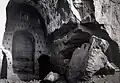 The cave consists of a rectangular room (3.6 x 4.8 meters; 12 x 15 feet), the entrance being on the long side, and the ceiling of which forms a transverse barrel vault.[73] In front of the cave, which is accessible through a door, there used to be an equally wide open space, perhaps adorned with paintings, with remains of a pyramid roof.[73] The two rooms are separated by a 1-meter (3 foot) thick wall.[29] The model for this kind of vaulted cave can be found in Bactria at Kara Tepe, dating from the 2nd-3rd century CE.[73]