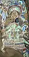 Carbon-testing and stylistical analysis helped determine three main periods in the paintings at Kizil, which cover a period from 300 CE to 650 CE.[47] The early art of Kizil correspond to the Western school of art in the Tarim Basin, and mainly displays influences from Gandhara and the Iranian world, particularly influence from the Hephthalites, and no influence from East Asia.[48][49][50][51]