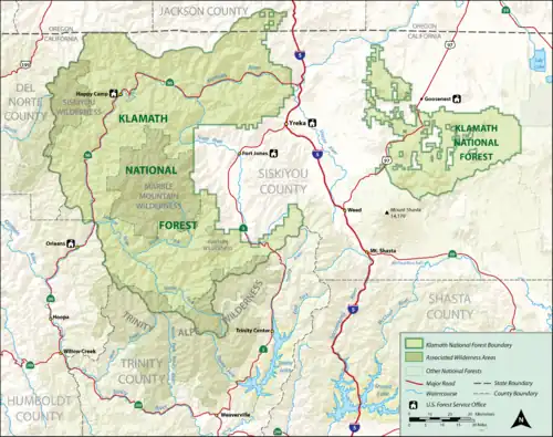 Klamath National Forest is a 1,737,774-acre (2,715 sq mi; 7,033 km2) national forest, in the Klamath Mountains and Cascade Range, located in Siskiyou County in northern California, but with a tiny extension (1.5 percent of the forest) into southern Jackson County in Oregon.[1] The forest contains continuous stands of ponderosa pine, Jeffrey pine, Douglas fir, red fir, white fir, lodgepole pine, Baker Cypress (Cupressus bakeri), and incense cedar. Old growth forest is estimated to cover some 168,000 acres (680 km2) of forest land.[2] Forest headquarters are located in Yreka, California. There are local ranger district offices located in Fort Jones, Happy Camp, and Macdoel, all in California. The Klamath was established on May 6, 1905.[3] This forest includes the Kangaroo Lake and the Sawyers Bar Catholic Church, which are located within the boundaries of the Forest. The Forest is managed jointly with the Butte Valley National Grassland.