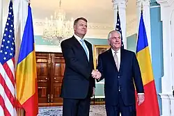 The collaboration with socialist Prime Minister Victor Ponta was praised by both sides at the start of the mandate, but deteriorated thereafter once with foreign visits of the Head of the Executive, without informing the President, but especially with the criminal prosecution of Victor Ponta for 22 alleged corruption charges, prompting Iohannis to demand his resignation from the head of the Government.[59] Relations with Parliament went similarly. Iohannis criticised the Parliament for defending MPs by rejecting the requests of the National Anticorruption Directorate for lifting their immunity, as in the case of PSD senator Dan Șova or Prime Minister Victor Ponta.[60] Regarding the judicial system, Iohannis pleads for a sustained fight against corruption. Likewise, Iohannis expressed dissatisfaction with attempted amendments to the Penal Code.[61] In the context of foreign policy, Iohannis and Andrzej Duda, the President of Poland, created Bucharest Nine during a meeting between both in Bucharest on 4 November 2015.[62] The Russian annexation of Ukrainian Crimea and the country's intervention in the east of Ukraine are the main reason for the creation of the organisation. It has nine members, Bulgaria, the Czech Republic, Estonia, Hungary, Latvia, Lithuania, Poland, Romania and Slovakia.[63][64]