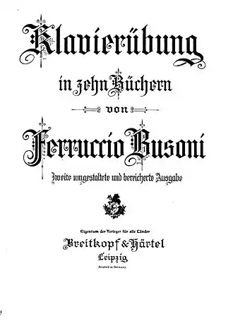 The Klavierübung was first published by Breitkopf & Härtel in separate parts beginning in 1918. Part 2 appeared in 1919, and parts 3 and 4 two years later. The fifth, and what was to be the final part, appeared in 1922. Kindermann, who prepared the first extensive catalog of Busoni's works in 1980, refers to this "First Edition" as Klavierübung in fünf Teilen [Piano Tutorial in Five Parts],[3] and Breitkopf & Härtel later republished a collected edition under this name ca. 1996.[4]