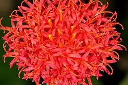 Kleinia stapeliiformis is an evergreen succulent plant belonging to the family Asteraceae, native to the Cape Provinces and Northern Provinces of South Africa.[1] It is sometimes referred to as the "pickle plant" or (inaccurately) as the "pickle cactus", due to its form. It grows erect, leafless stems with soft spines, and displays a green-and-white pattern visually similar to some Stapelia species, from which the species name derives. It grows to 30 cm (rarely up to 2.5 m) tall[2] and displays red or orange flowers (disc florets only; no ray florets) similar to those of a thistle in the summer.[3]