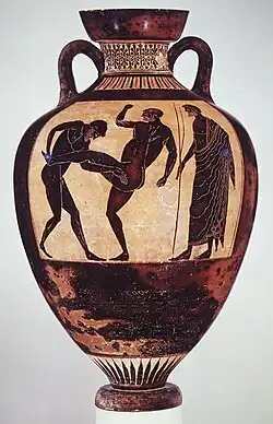However, in 1981 John Boardman demonstrated that the signature on the vase was a modern forgery, and the Kleophrades Painter returned to anonymity.[1] The Kleophrades Painter is thought to be the son of the potter Amasis, and the pupil of Euthymides, as his earliest work greatly resembles that of his master. He himself had pupils, which include the Berlin Painter and also the Boot Painter. Overall, the Kleophrades Painter is recognized as one of the greatest pot painters in the late Archaic period in Athens.