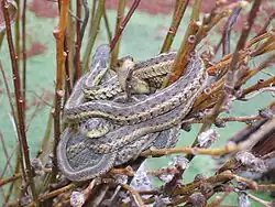 In white-backed mousebirds (Colius colius), individuals maintain rest-phase body temperature above 32 °C despite air temperatures as low as -3.4 °C.[10] This rest-phase body temperature was synchronized among individuals that cluster.[10] Sometimes, kleptothermy is not reciprocal and might be accurately described as heat-stealing. For example, some male Canadian red sided garter snakes engage in female mimicry in which they produce fake pheromones after emerging from hibernation.[11] This causes rival males to cover them in a mistaken attempt to mate, and so transfer heat to them.[11] In turn, those males that mimic females become rapidly revitalized after hibernation (which depends upon raising their body temperature), giving them an advantage in their own attempts to mate.[11]