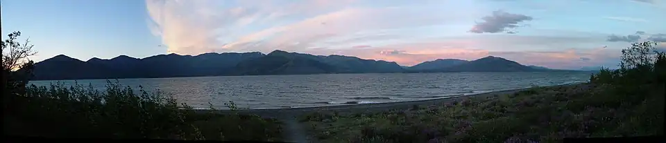 Until 2016,[2][3] Kluane Lake was fed by the A'ay Chu (Slims River),[1] which was composed of meltwater from the Kaskawulsh Glacier, located within Kluane National Park. Kluane Lake drains into the Kluane River, whose waters flow into the Donjek River, White River, Yukon River, and eventually the Bering Sea. The lake has a high density of large-bodied lake trout and whitefish[1]: 1  and is known for its fishing.