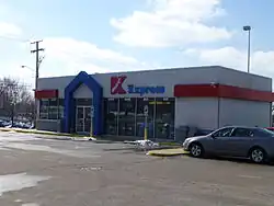 In 1990, in an effort to update its image, Kmart introduced a new logo.[48] It dropped the old-style italic "K" with a turquoise "mart" in favor of a red block letter K with the word "mart" written in script and contained inside the "K".[49][50] Kmart then began remodeling stores shortly thereafter.[51] This logo was replaced in 2004 with the current one.[52] In 1990, Little Caesars Pizza opened its first in-store Kmart restaurant in Rochester, Michigan[53] (coincidentally, Little Caesars and Kmart were both founded in Garden City, Michigan, in 1959 and 1962 respectively). In 1995, Kmart also tried to reinvent itself by using the short-lived name Today's Kmart.[54]