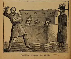 As early as 1905, an expose of Scottish Rite ritual specifically describes the stabbing of a skull crowned with a tiara.[15] This expose was originally written by abolitionist Jonathan Blanchard, leader of the post-Civil War Second Anti-Masonic Party.