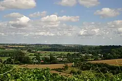 Blandford is situated between Cranborne Chase and the Dorset Downs, to the south-east of the Blackmore Vale, 13 mi (21 km) northwest of Poole and 22 mi (35 km) south-west of Salisbury. It is sited in the valley of the River Stour, mostly on rising ground northeast of the river, but with some development south of the river at Blandford St Mary.[24] The underlying geology is Cretaceous chalk bedrock that in places is overlain by Quaternary drift: alluvium in the river's flood plain, head deposits around the town's south-west, south and south-east borders, and clay with flints at the highest part of the town in the north.[25] The town is almost surrounded by land that has been designated as having landscape value of national significance: the Dorset National Landscape (an Area of Outstanding Natural Beauty, or AONB) to the west and the Cranborne Chase and West Wiltshire Downs AONB to the north and east.[26]