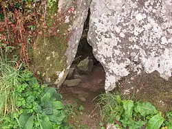 The interior chamber is accessed by a keyhole entrance at ground level, 80 centimetres (31 in) in width, which may suggest spiritual offerings were placed inside the structure in ancient times. The front face and keyhole entrance face northwest under a porch-like structure formed by the lower capstone. An up-growth of vines and other plants rises over the base of the doorstone at the front, and encloses the rear of the structure.[2]