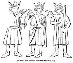 The abbey is well known for its wall-paintings which once covered the entire north wall of the chancel of the abbey's church, though they are now partially destroyed.[18] Though commonly referred to as frescoes, this is incorrect—they are in fact tempera, and there are no examples of true frescoes in any medieval churches in Ireland.[19] The tempera at Knockmoy constitute one of a group of only four such artworks in Ireland. It is unclear whether or not they were once coloured.[20] Long exposed to the elements, in the 1980s the Office of Public Works weather-proofed the segment of the abbey which houses them.[5]