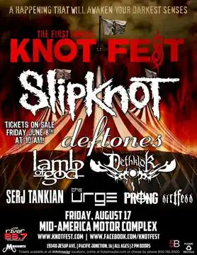 The inaugural Knotfest was a two-city event and took place on August 17, 2012, in Council Bluffs, Iowa, and August 18, 2012, in Somerset, Wisconsin.[3] Among the line-up were bands such as Deftones, Lamb of God, and Cannibal Corpse.[2] On March 24, 2014, it was officially announced that "Knotfest Japan" would be held in November 15 and 16 at Makuhari Messe, Tokyo.[4] Headliners were Slipknot, Korn, Limp Bizkit, Lamb of God, Five Finger Death Punch, Papa Roach, Bring Me the Horizon, Trivium and In Flames. On the first date of the Mayhem Festival 2014, Knotfest 2014 was announced, with it being held at the San Manuel Amphitheater in San Bernardino, California, on October 24–26.[5] Knotfest 2015 was to be held at the same location, from October 23 through 25. In December 2019, it was announced that Knotfest would be held in the United Kingdom for the first time in 2020.[6]