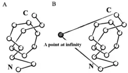(A) A protein is an open chain. (B) To create a closed loop, we pick a point at an infinite distance, and connect it to the N and C termini, thus the whole topological structure becomes a closed loop.