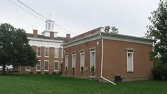 The Knox County Courthouse, located on the public square of Knoxville near its associated hall of records, is the former county courthouse of Knox County, Illinois. The courthouse was built in 1840 to replace the county's first courthouse; built in 1831 shortly after the county's organization, it had been outgrown by the end of the decade. Architect John Mandeville gave the building its Greek Revival design. The Hall of Records, which was designed by Charles Ulricson, was added in 1854 to house county records after the courthouse ran out of space for them. The Knox County seat moved to Galesburg in 1873; the courthouse and hall of records subsequently housed the Knoxville city hall and public library respectively until 1978, when the city government moved to the hall and the courthouse became a museum.[2]