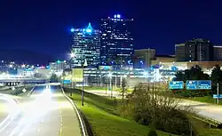 Development has also expanded across the Tennessee River on the South Knoxville waterfront. In 2006, the city adopted the South Waterfront Vision Plan, a long-term improvement project to revitalize the 750-acre waterfront fronting three miles of shoreline on the Tennessee River.[65] The project's primary focus is the commercial and residential development over a 20-year timeline.[65] Knoxville Baptist Hospital, located on the waterfront, was demolished in 2016 to make room for a mixed-use project called One Riverwalk.[66] The development consisted of three office buildings, including a headquarters for Regal Entertainment Group, a hotel, student housing, and 300 multi-family residential units.[66]