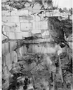 Other companies that sprang up during this period were Knoxville Woolen Mills, Dixie Cement, and Woodruff's Furniture. Between 1880 and 1887, 97 factories were established in Knoxville, most of them specializing in textiles, food products, and iron products.[49] By the 1890s, Knoxville was home to more than 50 wholesaling houses, making it the third largest wholesaling center by volume in the South.[49] The Candoro Marble Works, established in the community of Vestal in 1914, became the nation's foremost producer of pink marble and one of the nation's largest marble importers.[50] In 1896, Knoxville celebrated its achievements by creating its own flag.[51] The Flag of Knoxville, Tennessee represents the city's progressive growth due to agriculture and industry.[52]