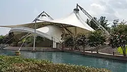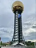 With further annexation attempts stalling, Knoxville initiated several projects aimed at boosting revenue in its downtown area. The 1982 World's Fair—the most successful of these projects, with eleven million visitors—became one of the most popular expositions in U.S. history.[60] The Rubik's Cube made its debut at this event.[61] The fair's energy theme was selected because Knoxville was home to TVA's headquarters and for its proximity to Oak Ridge National Laboratory. The Sunsphere, a 266-foot (81 m) steel truss structure topped with a gold-colored glass sphere, was built for the fair and remains one of Knoxville's most prominent structures,[62] along with the adjacent Tennessee Amphitheater.
