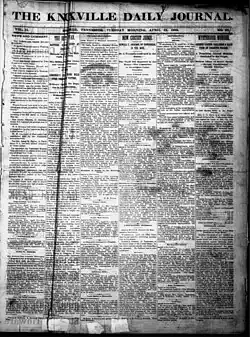 ![]() The Knoxville Journal for Wednesday, April 14, 1886, the first issue bearing this title | |