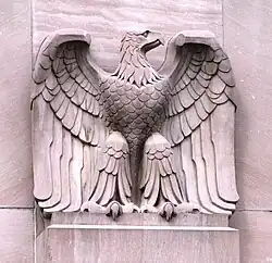 The building was constructed using six different types of Tennessee marble,[2] a locally quarried stone used in monumental buildings throughout the United States.[4] The exterior, clad mostly in Tennessee "pink" marble, includes a facade of imposing columns, Moderne-style cylindrical molding along the roofline,[2] and four eagle statues carved by Candoro Marble Works sculptor Albert Milani (1892–1972).[4] The entrances are located at the corners of the building, while the front of the building contains aluminum casement windows and a sunken courtyard. This courtyard is masked by a retaining wall built of red Tennessee marble, and topped with Art Deco light fixtures.[2]