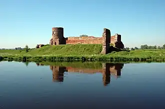 Koło Castle - a Gothic castle, which according to Jan Długosz was raised by Casimir III the Great before the year of 1362 (when Koło received its town rights). The castle secured the route from Greater Poland to Łęczyca, in the lowlands of the River Warta. The castle is located on an artificial hill on a meander of the River Warta. During the raising of the castle, the river had a number of tributaries in the area, which were important for the castle's strategic location.[1]