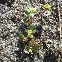 Koenigia islandica is a minute, hairless, annual plant with a slender taproot. It grows to a height of 1 to 2 cm (0.4 to 0.8 in) and is one of the world's smallest plants. It has simple or branched, often reddish, stems which root at the lower nodes. The leaves are in opposite pairs, fused at the base to a short sheath which surrounds the stem; the leaf blades are up to 3 mm (0.12 in) long, obovate, oblong or elliptic, with a blunt tip. The inflorescence is a few-flowered cyme with several bracts. The individual flowers are green, white or pinkish, bisexual, with three tepals, three stamens and three fused carpels. The fruit is a three-sided nut containing a single seed.[2] Flowering occurs during July and August.[1]