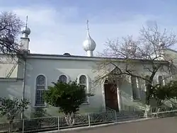 The Narbutabey Madrassah was built in the 1790s. Its graveyard includes the tomb of Muhammad Umar Khan and his wife, the famous Uzbek poet Nodira.[15] Known as the Modari Khan Mausoleum, it is ornately decorated with glazed blue mosaic tiles. Unlike the other madrassahs in Kokand which were closed by the Soviets, the Narbutabey Madrassah remained active as a place of Quranic study until 2016.[13]
