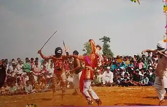 The God of mountains (Dongaridev) is worshiped in the belief that God resides in a mountain cave and that his happiness and sadness affect the life's joys and sorrows. Dongaridev festival is celebrated by the whole villages and at least one person from each family in the village has to participate in this festival. 70–80 young and old people come together and dance in a circular motion and sing songs in their dialect. Various instruments are used for worship in this festival viz. flags, ghoongru kaathi (stick with bells), pawri, tapra, many marigold flowers, nachani and rice grains. The festival usually lasts for eight to ten days and finally, on the night before the full moon, they go at the foot of the mountain, dance all night, sing kokni songs, and descend from the hill in the morning after worshiping the mountain. During this festival all the virtues of kindness, cordiality, generosity, honesty, discipline, community life, purity of mind are 'discovered'.[10]