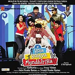 Kola Kolaya Mundhirika is a 2010 Indian Tamil-language comedy film co-written by Crazy Mohan and directed by Madhumitha.[1] The film stars Jayaram, Karthik Kumar, and Shikha along with numerous popular Tamil comedy artists including M. S. Bhaskar, Pandiarajan, Anandaraj, Vasu Vikram and Vaiyapuri playing supporting roles. The film started its shooting on 8 May 2009 and released on 21 May 2010.[2]