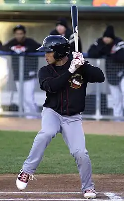 As a freshman, he played center field and batted .341 with 11 HR. During his sophomore year, he hit .357 with a .534 slugging percentage (SLG), .436 on-base percentage (OBP), 19 stolen bases and 40 runs batted in (RBIs).[1][2] Playing for the Orleans Firebirds of the Cape Cod Baseball League (CCBL) in 2010, he was named a CCBL All-Star and the Pat Sorenti Most Valuable Player.[8][9] His batting average (.341) ranked him third in the CCBL that summer, his slugging (.452) was fourth, OBP (.426) second, and stolen bases (22) second, while making just four errors in 145 chances for a .972 fielding percentage.[10][8] Wong was inducted into the CCBL Hall of Fame in 2016.[11]