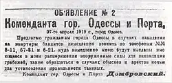 - City commandant— in Russia was in every city and in those villages where two or more separate military units or teams were located. To fill the commandant positions in St. Petersburg, Moscow, Tsarskoye Selo, Gatchina, Petergof, Warsaw, Tiflis, Nikolaev and some other cities, special persons were appointed. In other cities, the duties of the commandant were assigned to district military commanders, and where there were none, to one of the officers of the local garrison. City commandants were subordinate to the chief commander of the military district and the head of the garrison.[10]