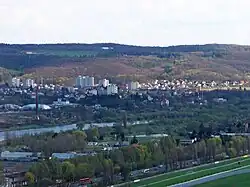 The southern part of Komořany is bisected by Prague's Outer Ring Road. The ring road crosses the Vltava river valley above grade - a structure known as the Radotínský Bridge. The east of the bridge lands in Komořany, where an unfinished intersection awaits the completion of the Komořany bypass, before continuing on into the east portal of the Komořany tunnel. There was a dispute over the partial construction of the intersection, fueled by controversy over construction of the bypass itself and irregularities in the building permits.[5][6]