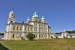 As a consequence of its high profile, the monastic community could fund extensive building projects, starting with the construction of a new cathedral in 1800–09. This huge two-storey eight-pillared building was designed by a local starets. It is surmounted by five octagonal drums bearing five blue bud-shaped domes. The same style is applied to the three-storey belltower (1810–12), rising to the height of 35 meters. Several other churches, a quay and an inn were added in the course of the century. Two sketae were set up to mark the ancient locations of the monastery.