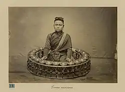 The kong vong toch (Khmer: គងវង់តូច or kong touch Khmer: គងតូច) is a number of gongs that are attached to a circle-shaped rack, closely resembling its larger relative, the kong thom. Both instruments belong to the percussion family of traditional Khmer instruments, along with the roneat ek, roneat dek, and roneat thung. These instruments are all performed in the pinpeat and mahaori orchestras. The kong toch is made of three parts; the frame of the gong circle, the gongs themselves, and the gong mallets.