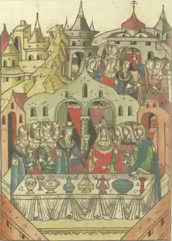 ![]() The marriage of Konstantin, miniature from the Illustrated Chronicle of Ivan the Terrible (16th century)  | |