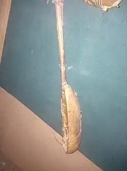 The instrument uses a calabash gourd as the body of the instrument, covered by skin, with a stick for a neck.[1][2] Modern instrument have had the gourd replaced by a can, such as a large sardine can.[1][3] The neck on the Kontigi has "metal disk surrounded by small rings" which make noise as the instrument is moved or played.[2] The tone is high pitched.[2]