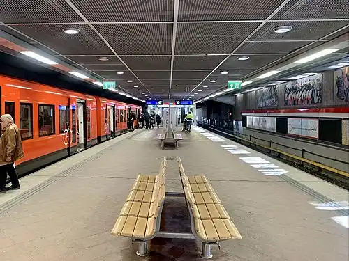 Kontula metro station (Finnish: Kontulan metroasema, Swedish: Gårdsbackas metrostation) is a ground-level station on the M2 line (Tapiola - Mellunmäki) of the Helsinki Metro.[2] There are 273 bicycle and 53 car parking spaces at Kontula.[3] The station serves the district of Kontula in East Helsinki.