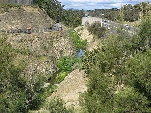 Koonung Creek (or Koonung Koonung Creek) is a small tributary of the Yarra River in Melbourne's east. The creek originates in Nunawading near Springvale Road, and flows to join the Yarra at the border between Ivanhoe East, Bulleen and Balwyn North. The place the two waterways meet forms the borders between these suburbs. Bushy Creek (now carried by an underground pipe) is a tributary to the creek, joining near Elgar Park in Mont Albert North. A shared use path follows the course of the creek (and therefore also the Freeway), known as the Koonung Creek Trail.