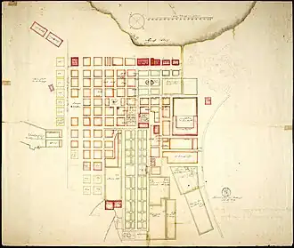 The company had imposed a grid of streets on the settlement, which divided it into blocks. Block J was bordered by Strand Street, Long Street, Castle Street and Burg Street and was divided into 10 erven (plots). Erven 7 and 8, on the Strand Street side, were granted by Governor Willem Adriaan van der Stel to Reijnier Smedinga in 1699 and 1701 respectively. Erf 8 is the site of the Koopmans-de Wet House.[5]