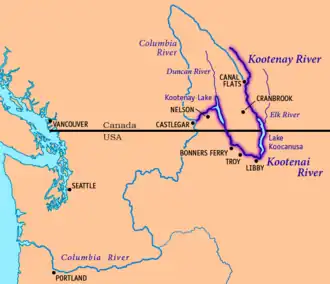 ![]() Map of the Kootenay/Kootenai River, its main tributaries and lakes, and major cities. | |