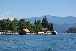Fisherville, which had a Hudson's Bay post and other businesses, continued on with a few hundred residents for a few years (most of them Chinese by the end, as was the case with many other BC gold towns also) but was eclipsed as a supply centre with the creation of nearby Fort Steele. The Chinese miners continued to work the "played-out" claims abandoned by American and Canadian miners, taking what little gold was left. Fisherville eventually was abandoned, its buildings left to ruin, and little remains of the settlement today.[50][53] Other gold rushes on the Moyie and Goat Rivers, tributaries of the Kootenay, were followed by the discovery of silver and galena mines in the Kootenay Lake and Slocan Valley areas (Silvery Slocan), leading rapidly to the settlement of the region and the creation of various "silver city" boomtowns, notably Nelson, at the outlet of Kootenay Lake, Kaslo, midway up its north arm, New Denver, Silverton, Slocan City and Sandon in the 1880s and 1890s.[54] By 1889, a smelter had been constructed close to the mouth of the Kootenay, near Revelstoke, to process ore from the mines.[55] Serving the mines and settlers, steamer companies plied the Kootenai River from Bonners Ferry, Idaho to Nelson and to the Lardeau or "Lardo" district at the north end of Kootenay Lake, and also on the upper Kootenay River between the Cranbrook-Fort Steele area and points in Montana.[56]