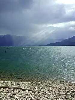 The river is known as the "Kootenay" in Canada and by the Ktunaxa Nation,[7] and as the "Kootenai" in the United States and by the Confederated Salish and Kootenai Tribes and Kootenai Tribe of Idaho.[5] Fed mainly by glaciers and snowmelt, the river drains a rugged, sparsely populated region of more than 50,000 km2 (19,000 sq mi), of which over 70 percent is in Canada. From its headwaters to its confluence with the Columbia River, the Kootenay descends more than 2,000 metres (6,600 ft). At their confluence, the Columbia and Kootenay are similar in length, drainage area, and volume, but less of the Kootenay is impounded in reservoirs and thus it has more free-flowing stretches with rapids and falls. Part of the lower Kootenay forms Kootenay Lake, one of the largest natural lakes in British Columbia.