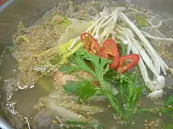 Korean noodles are noodles or noodle dishes in Korean cuisine, and are collectively referred to as guksu in native Korean or myeon in hanja character. The earliest noodles in Asia originate from China, and date back 4,000 years ago.[1] In Korea, traditional noodle dishes are onmyeon (beef broth-based noodle soup), called guksu jangguk (noodles with a hot clear broth), naengmyeon (cold buckwheat noodles), bibim guksu (cold noodle dish mixed with vegetables), kalguksu (knife-cut noodles), kongguksu (noodles with a cold soybean broth) among others. In royal court, baekmyeon (literally "white noodles") consisting of buckwheat noodles and pheasant broth, was regarded as the top quality noodle dish. Naengmyeon, with a cold soup mixed with dongchimi (watery radish kimchi) and beef brisk broth, was eaten in court during summer.[2]
