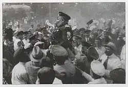 In June 1917, General Lavr Kornilov, the commander of the Russian Eighth Army in the Southwestern Front, ordered the creation of a volunteer shock detachment from soldiers and officers, which became known as the 1st Shock Detachment.[3] He let an adjutant at the Eighth Army headquarters, Captain Mitrofan Nezhentsev, form the unit, who put it together initially from officers and praporshchiks. Nezhentsev wanted the shock unit to be an example to inspire the rest of the army, in response to the indiscipline following the February Revolution. After spending some time in training, the Shock Detachment consisted of two battalions, three machine gun detachments, a recon unit with Czechoslovak volunteers, and a cavalry scout unit with Don Cossacks. Captain Nezhentsev was in command. The unit was finished forming by early July 1917 and received its banner from General Kornilov, which was black and had the words "1st Shock Detachment." They added "Kornilov" to the name.[4]