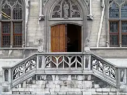 Between 1856 and 1875 the architect Pierre Nicolas Croquison had the city hall restored, creating the current appearance. The 19th century statues of the facade represent the counts and countesses of Flanders: On the far left is Baldwin Iron Arm and on either side of the small balcony are father Thierry, Count of Flanders aka Diederik (1099-1168) and son Philip van de Elzas (1143-1191) with the coat of arms of Flanders on his chest, which he introduced, the Countess Beatrice of Brabant (1225-1288), lady of the castle of Kortrijk, Count Baldwin IX (1172-1205) with a cross next to his daughter, Joan, Countess of Flanders (1199-1244), often called Joan of Constantinople, and her younger sister, Margaret of Constantinople (1202-1280). The next statue represents Guy of Dampierre (1226–1305), followed by Philip the Good (1396–1467) wears the distinctive chain of the Order of the Golden Fleece, which he founded, Charles V, Holy Roman Emperor (1500-1558), Albert VII, Archduke of Austria (1559–1621) and Isabella Clara Eugenia (1566–1633) which is around the corner of the building in Leiestraat.[1]
