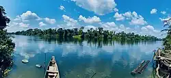 The Korup National Park is in the Southwest Province of Cameroon and lies between 4°54' and 5°28' N latitude and 8°42’ to 9°16’ E longitude.[2] It is 50 km north of the Bight of Biafra and 20 km from the edge of the mangrove swamps of the Rio Del Rey estuary. It shares about 15 km of its western boundary with the Cross River National Park's Oban Division in Nigeria.[1] The area surrounding the park also contains Ejagham, Nta Ali and Rumpi Hills forest reserve.[3]